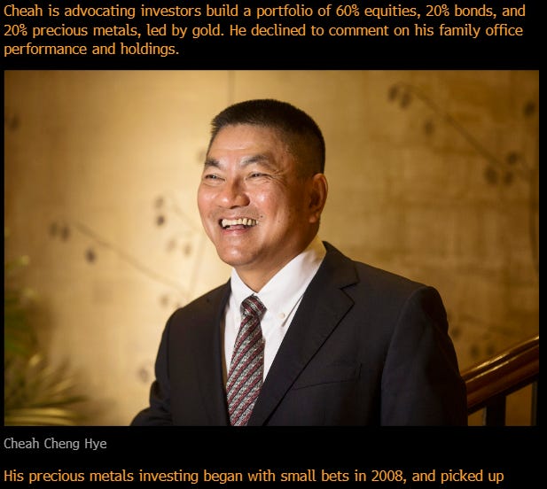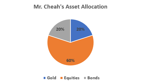 Mr. Cheah ran his business, owned stocks, a few bonds, and kept buying a little gold the whole time. He recommends this asset allocation to serious wealth-builders.